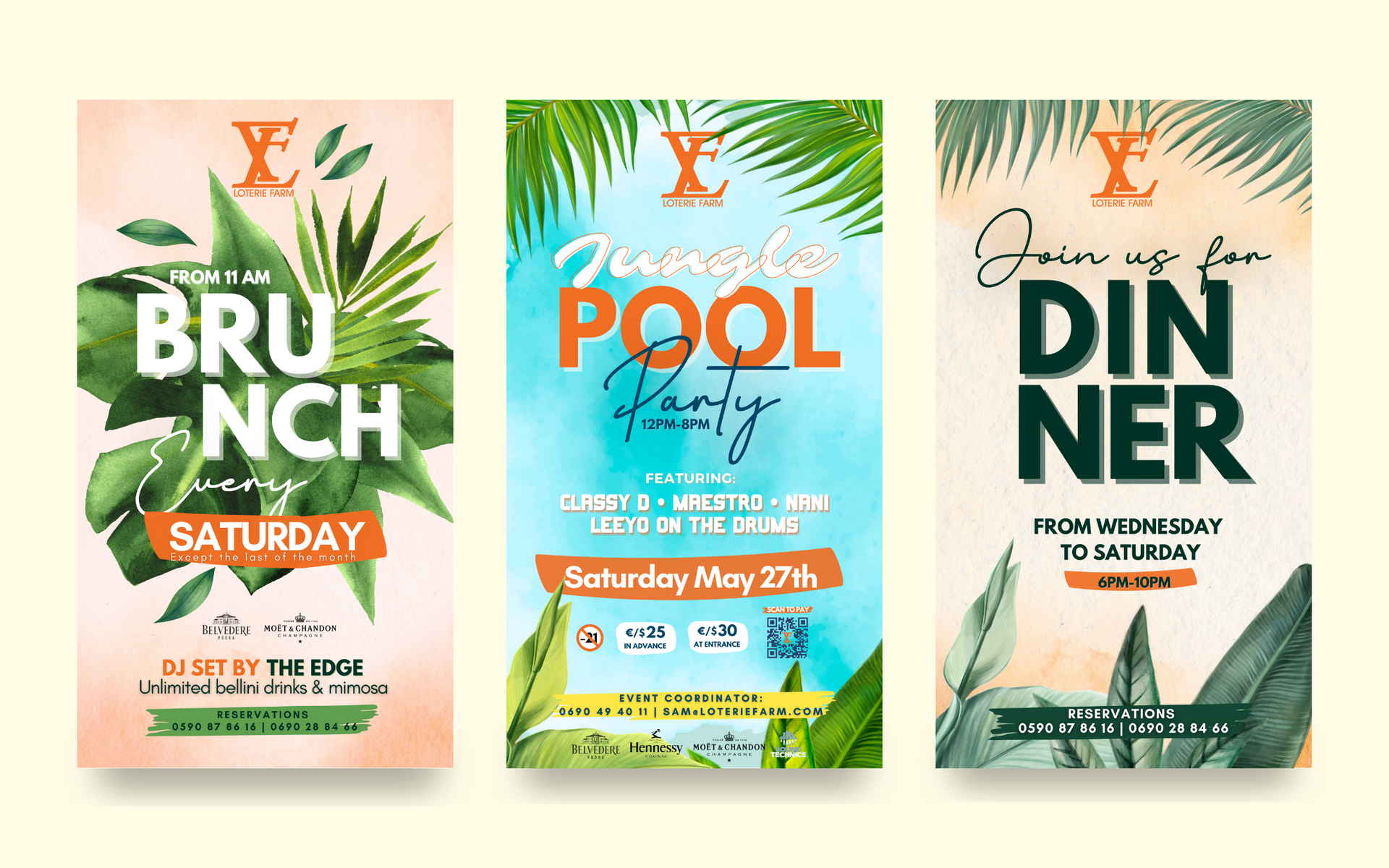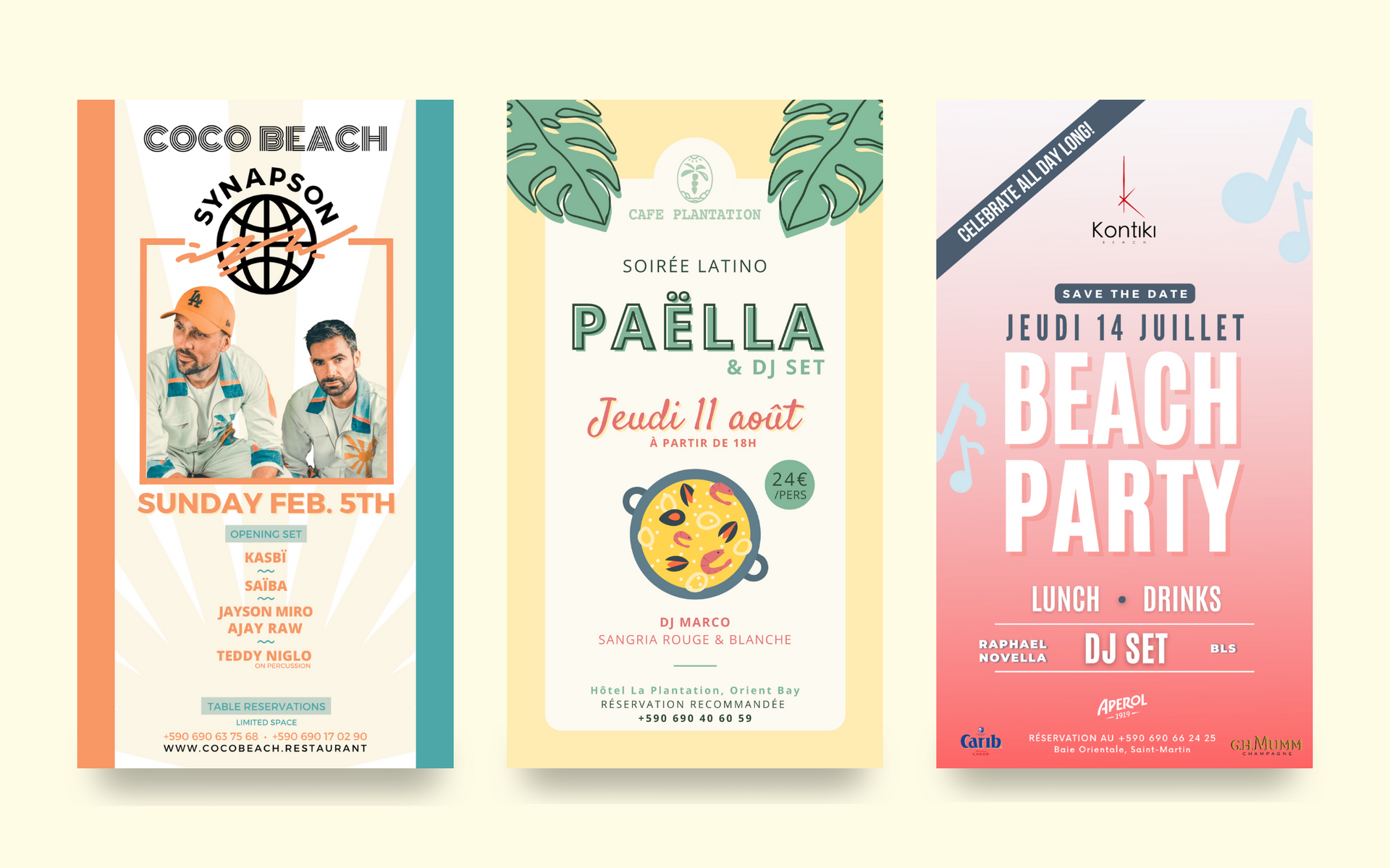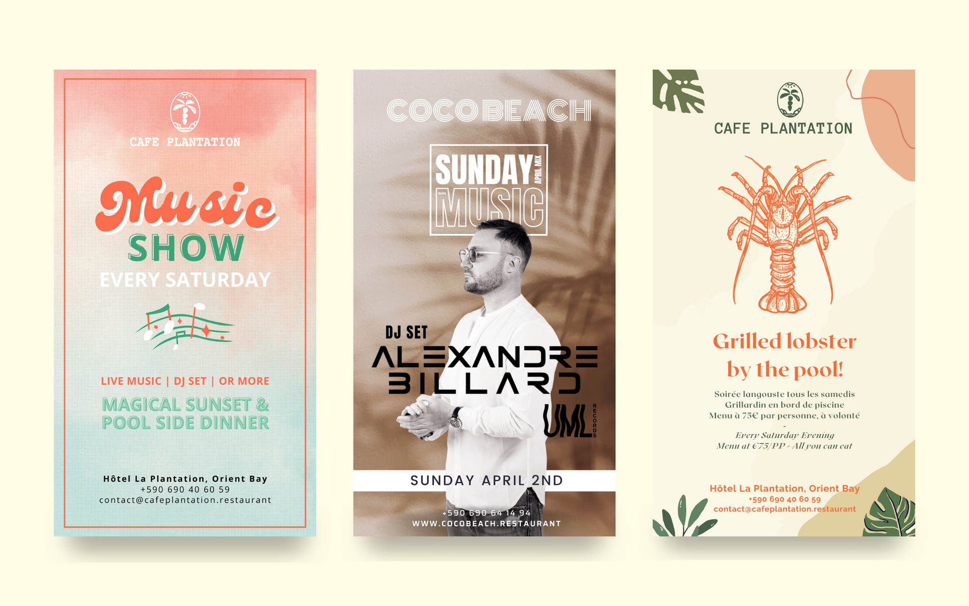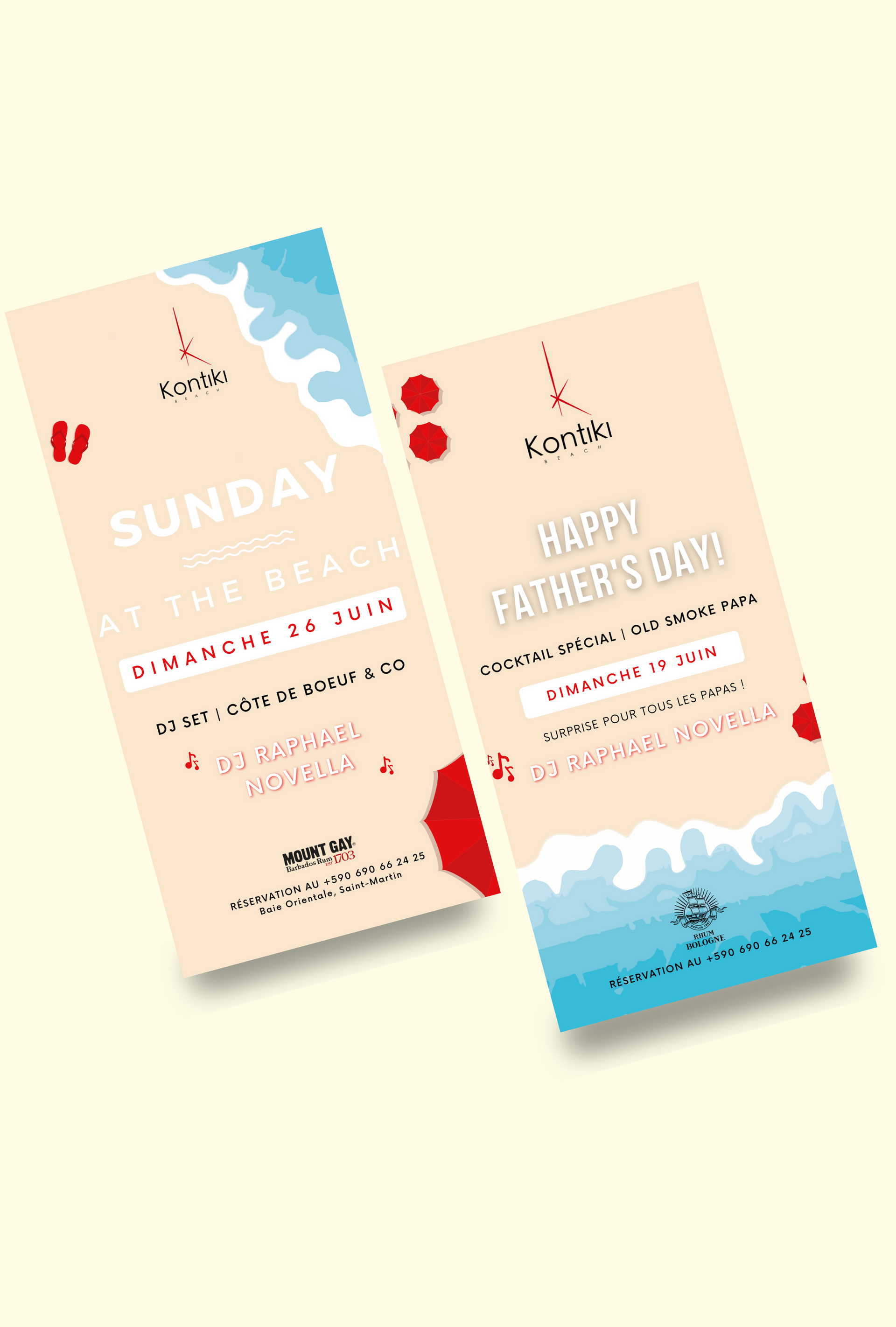Chaque semaine, nous créons des flyers print et digitaux pour nos clients afin qu'ils puissent annoncer leurs événements hebdomadaire ou mensuel. L'objectif étant d'attirer leur clientèle, nous élaborons des flyers qui ressemble à leur établissement et atmosphère. Qu'ils aient une vocation uniquement digitale via les réseaux sociaux ou qu'ils soient imprimés pour une distribution physique, notre travail de mise en page reste identique. Le flyer a un avantage unique : il peut être diffuser partout : dans la rue, dans les commerces ou en mains propre.